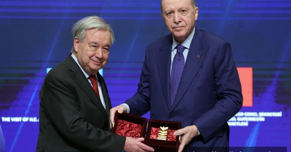 Türkiye Cumhurbaşkanı Recep Tayyip Erdoğan, Birleşmiş Milletler (BM) Genel Sekreteri Antonio Guterres'i kabul etti. Cumhurbaşkanı Erdoğan, Guterres'i Cumhurbaşkanlığı Külliyesi'nin giriş kapısında karşıladı. Erdoğan ve Guterres, tokalaşarak fotoğraf çektirdi. Guterres, Muhafız Alayı Tören Kıtası'nı "Merhaba asker" diyerek selamladı. Karşılamanın ardından, Cumhurbaşkanı Erdoğan ve BM Genel Sekreteri Guterres görüşmeye geçti. Görüşmede, Dışişleri Bakanı Hakan Fidan ile Cumhurbaşkanı Dış Politika ve Güvenlik Başdanışmanı Akif Çağatay Kılıç da yer aldı. Cumhurbaşkanı Erdoğan, görüşmenin ardından Beştepe Millet Sergi Salonu'nda BM Genel Sekreteri Guterres'e Atatürk Uluslararası Barış Ödülü'nü takdim etti. Törende konuşan Erdoğan, Guterres'in Türkiye'yi her ziyaretinin ayrı bir önem ve mana taşıdığını, 2017'de genel sekreterlik görevini üstlenmesinin ardından ilk ikili ziyaretini Türkiye'ye gerçekleştirdiğini söyledi. Guterres'in, müteakip her ziyaretinde, mültecilerin korunması, küresel adaletin tesisine dair projelerin uygulanması ve Ukrayna'daki savaş bağlamında mekik diplomasisine yaptığı çok değerli katkılara hep birlikte şahit olduklarını dile getiren Erdoğan, "Uluslararası barış ve güvenliğin tesisi için adeta sessiz çoğunluğun sesi olan değerli dostuma bu altıncı ziyareti vesilesiyle Atatürk Uluslararası Barış Ödülü'nü takdim etmekten büyük bir memnuniyet duyuyorum." ifadesini kullandı Büyük bir özveriyle çalıştığına şahidim BM Genel Sekreteri Guterres'in çağın en büyük mezalimlerinden birinin yaşandığı Gazze'de sergilediği duruşun her zaman övgüyle anılacağının altını çizen Erdoğan, insanlık değerlerinin sınandığı bu vahşetin karşısında Guterres'in kendisinden beklenen ilkesel tavrı güçlü şekilde ortaya koyduğunu, Birleşmiş Milletler parametreleri temelinde iki devletli çözüm yönünde çalışma kararlılığından asla taviz vermediğini belirtti. Erdoğan, Guterres'in gönlünde müstesna bir yere sahip olan mültecilerin korunmasının ise yakın işbirliği içinde çalıştıkları bir başka alan olduğunu, bunun da hiçbir zaman unutulmayacağını vurguladı. Cumhurbaşkanı Erdoğan, asrın felaketinin ardından yaşanan zor günlerde dost elini uzatarak yaraların sarılmasına destek olan tüm Birleşmiş Milletler Teşkilatı'na Genel Sekreterin şahsında teşekkür etti. Cumhurbaşkanı Erdoğan, daha sonra BM Genel Sekreteri Guterres'e Atatürk Uluslararası Barış Ödülü'nü takdim etti Türk halkına teşekkür etti Guterres, sözlerine Cumhurbaşkanı Erdoğan’a, Türkiye hükümetine ve Türk halkına teşekkür ederek başladı. BM Genel Sekreteri, ödülün çok büyük ızdıraplar, çatışmalar, giderek derinleşen jeopolitik bölünmelerin olduğu bir dönemde geldiğini söyledi. Küresel işbirliğine olan güvenin azaldığını aktaran Guterres, ödülün barışın "soylu bir vizyonun ötesinde bir şey olduğunu" gösterdiğini belirtti. Dünyanın en zorlu yerlerinde insani yardım faaliyetleri yaptıklarını ve barış gücü olarak çalıştıklarını aktaran Guterres, ödülün aynı zamanda başta Gazze olmak üzere hayatını kaybeden BM personeline verildiğini vurguladı. Guterres, "Bu ödülün anlamı Mustafa Kemal Atatürk'ün hayatı ve mirasından ayrı düşünülemez. Zorluklarla ve gösterdiği liderlikle Atatürk, barışın şans eseri ortaya çıkmadığını anlamıştır. Barış bir tercihtir. Barış, sosyal uyum içerisinde yer alan ve uluslararası işbirliğiyle gelişen bir tercihtir." şeklinde konuştu. BM Genel Sekreteri, Atatürk'ün "Yurtta barış, dünyada barış" sözünü anımsatarak bunun aynı zamanda BM Şartının ruhunu da çok iyi yansıttığını belirtti Türkiye'nin Gazze'deki ara buluculuk faaliyetleri Cumhurbaşkanı Recep Tayyip Erdoğan'ın eşi Emine Erdoğan'ın Sıfır Atık inisiyatifi kapsamında yapmış olduğu çabaları desteklediğini kaydeden BM Genel Sekreteri, bu yılın sonunda COP31'in Türkiye'de yapılacağını anımsattı. Guterres, Türkiye'nin Filistin halkının hakları ve onuru için yaptığı çalışmalara işaret ederek, Ankara'nın, Gazze'deki ateşkes ve rehinelerin serbest bırakılmasındaki arabuluculuk faaliyetlerine dikkati çekti. BM Genel Sekreteri, ABD ve İsrail'in başlattığı saldırıların hem İran'ı hem de birçok ülkeyi etkilediğini aktararak, bölgenin kırılma noktasına sürüklendiğine dikkati çekti. Bölgedeki saldırılar nedeniyle ticaretin kesintiye uğradığına, enerji fiyatlarının arttığına ve istikrarsızlaşmanın başladığına işaret eden Guterres, bu durumdan en çok yoksul ve ihtiyaç sahibi insanların etkilendiğini anımsattı. BM Genel Sekreteri, söz konusu ödülü almaktan onur duyduğunu belirterek, Cumhurbaşkanı Erdoğan'a teşekkürlerini sundu Fidan, Guterres ile bir araya geldi Dışişleri Bakanı Hakan Fidan, Ankara’da Guterres ile bir araya geldi. Diplomatik kaynaklardan edinilen bilgiye göre Fidan, Bakanlıkta Guterres ile görüştü
