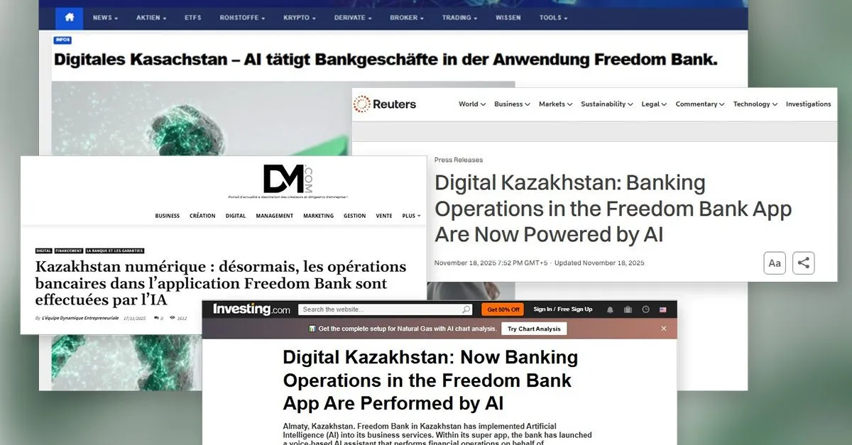Kazak fintech çözümleri Avrupa ve ABD'nin önde gelen iş medyasının gündemindeydi. Aralarında Reuters, Associated Press, Yahoo Finance, Investing, Funds Europe, Morningstar, Dynamique Entrepreneuriale'nin de bulunduğu 700'den fazla uluslararası medya ve haber toplayıcı, Freedom Bank davaları hakkında