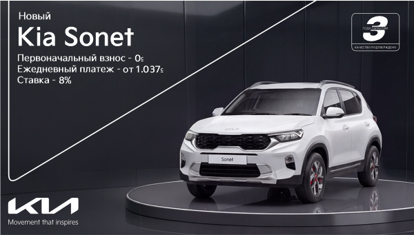 Официальный дистрибьютор Kia в Кыргызстане запускает специальное предложение, которое делает покупку нового кроссовера еще проще и доступнее Теперь стать владельцем стильного и технологичного Kia Sonet можно на максимально комфортных условиях:0 сомов - первоначальный взнос.От 1 037 сомов в день - понятная и удобная оплата.Ограниченное количество автомобилей по специальному предложению.Предложение действует ограниченное время и доступно только в "Kia Кыргызстан".Почему Kia Sonet - это больше, чем просто кроссоверВысокий дорожный просвет - уверенно чувствует себя на городских улицах, проселочных дорогах и зимних трассах Кыргызстана.Экономичный расход топлива - экономия на каждом километре, идеально подходит для ежедневных поездок и путешествий.Фирменная гарантия Kia 3 года или 100 000 км - уверенность и спокойствие в каждой поездке.Современные технологии - системы безопасности, мультимедийный экран, круиз-контроль и продуманная эргономика салона.Стильный дизайн и компактные размеры - удобство парковки и маневров в условиях города.Более подробную информацию о Kia Sonet вы можете узнать на сайте kia-bishkek.kg.Как воспользоваться предложением:Приезжайте в Kia Center Bishkek.Выберите комплектацию Kia Sonet, которая подходит именно вам.Оформите покупку без первоначального взноса с оплатой 1 037 сомов в день.Забирайте свой новый Sonet и наслаждайтесь каждой поездкой.Контакты:📍 Адрес: Бишкек, ул. Жукеева-Пудовкина, 85/4. 🌐 Сайт: www.kia-bishkek.kg. 📞 Контакт-центр: 0 сомов - первоначальный взнос.От 1 037 сомов в день - понятная и удобная оплата.Ограниченное количество автомобилей по специальному предложению.Предложение действует ограниченное время и доступно только в "Kia Кыргызстан".Почему Kia Sonet - это больше, чем просто кроссоверВысокий дорожный просвет - уверенно чувствует себя на городских улицах, проселочных дорогах и зимних трассах Кыргызстана.Экономичный расход топлива - экономия на каждом километре, идеально подходит для ежедневных поездок и путешествий.Фирменная гарантия Kia 3 года или 100 000 км - уверенность и спокойствие в каждой поездке.Современные технологии - системы безопасности, мультимедийный экран, круиз-контроль и продуманная эргономика салона.Стильный дизайн и компактные размеры - удобство парковки и маневров в условиях города.Более подробную информацию о Kia Sonet вы можете узнать на сайте kia-bishkek.kg.Как воспользоваться предложением:Приезжайте в Kia Center Bishkek.Выберите комплектацию Kia Sonet, которая подходит именно вам.Оформите покупку без первоначального взноса с оплатой 1 037 сомов в день.Забирайте свой новый Sonet и наслаждайтесь каждой поездкой.Контакты:📍 Адрес: Бишкек, ул. Жукеева-Пудовкина, 85/4. 🌐 Сайт: www.kia-bishkek.kg. 📞 Контакт-центр: Предложение действует ограниченное время и доступно только в "Kia Кыргызстан" Высокий дорожный просвет - уверенно чувствует себя на городских улицах, проселочных дорогах и зимних трассах Кыргызстана.Экономичный расход топлива - экономия на каждом километре, идеально подходит для ежедневных поездок и путешествий.Фирменная гарантия Kia 3 года или 100 000 км - уверенность и спокойствие в каждой поездке.Современные технологии - системы безопасности, мультимедийный экран, круиз-контроль и продуманная эргономика салона.Стильный дизайн и компактные размеры - удобство парковки и маневров в условиях города.Более подробную информацию о Kia Sonet вы можете узн