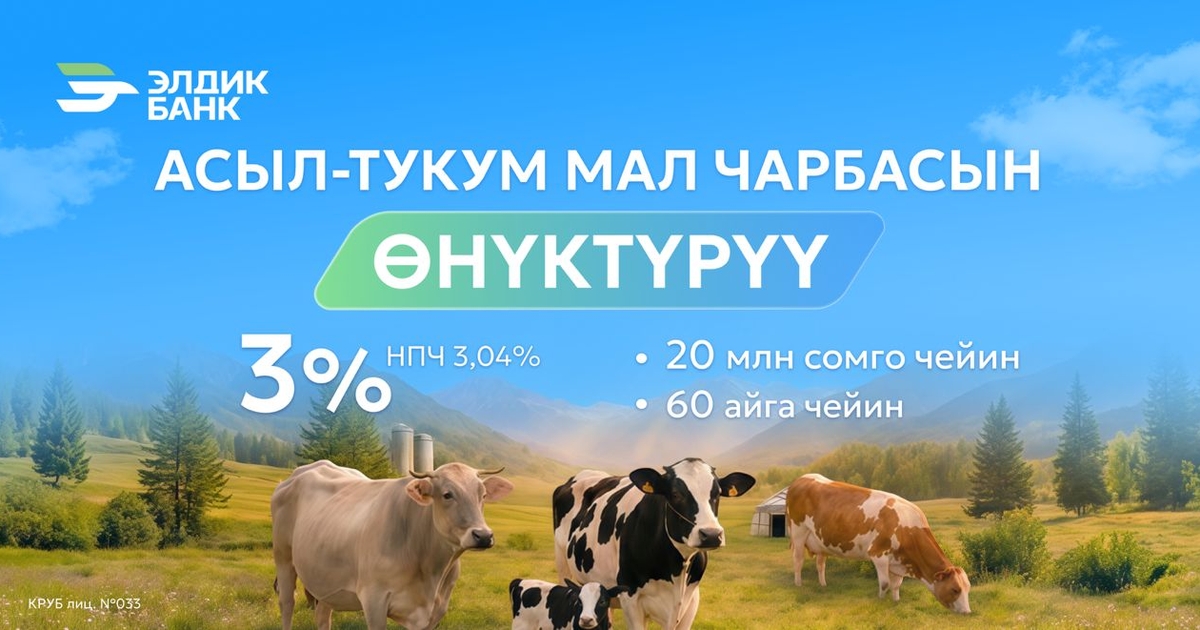 Bişkek, 26.02.26. /Kabar/. Kırgızistan'ın "Eldik Bankası" ishtegenderge atayyn karzhyloo programıson ishke kyrgyzdi Kimderge ileyiktuu programı: Asyl tukum mal charbasyn koldoo, porodalardy zhakshyrtuu zhana onduurumduuluktu zhogorulatuu Alatau, Hereford, Holstein, Simmental, Aishir, Brown Swis